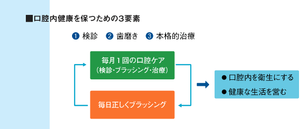 「検診・ブラッシング・治療」を行う口腔ケアは、利用される皆様の口腔内を良好な 状態へ保つようサポートいたします。